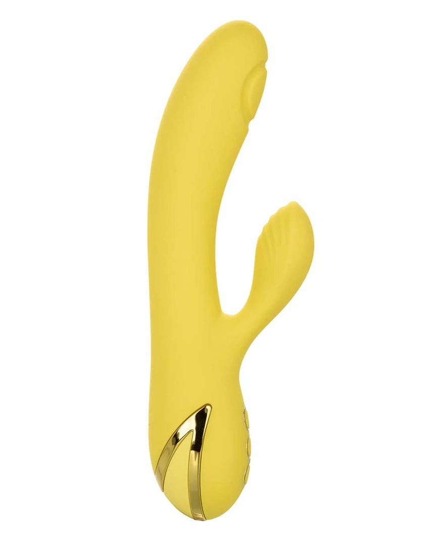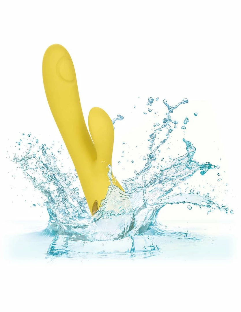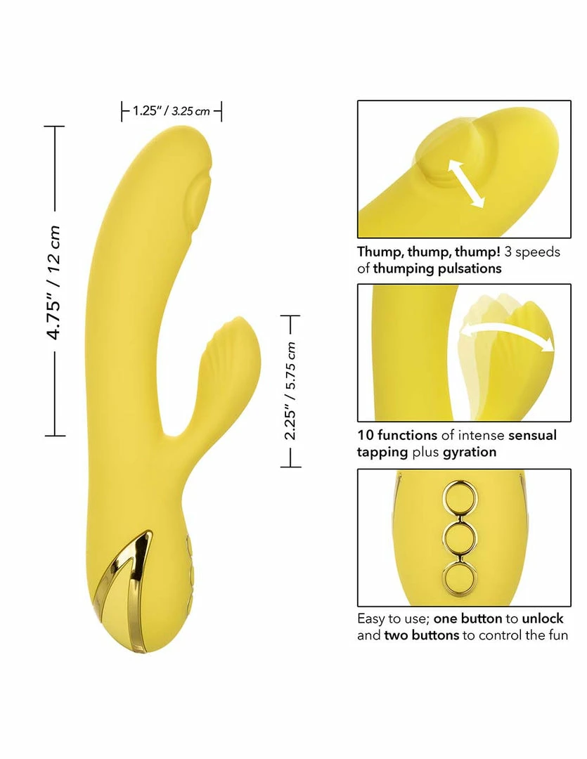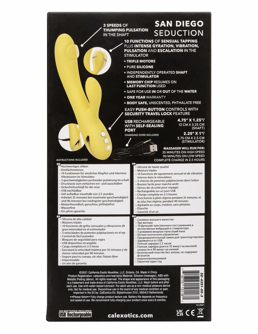 Go down into the coastal escape that is the California Dreaming San Diego Seduction. This powerful dual vibrator includes 10 tapping and gyrating functions and 3 thumping speeds. The long ergonomic end aims to please the g-spot getting into your pleasure points as the rabbit massaging end tantalizes your exterior. There are three powerful motors that have tapping, vibrating, and thumping motions which harmoniously move along to stimulate all your pleasure points. The curved, ergonomically shaped shaft aims to tantalize your g-spot as you customize your experience with the various functions. The clitoral teaser evokes a tapping motion which will bring you a melodic external pleasure. The shaft measures with 4.75 by 1.25 inches while the stimulating smaller end measures with 2.25 by 1 inches. The soft silicone material is body safe and waterproof. You may enjoy the San Diego experience up to 90 minutes with a full 2.5 hour charge as the kit includes a USB charger. To amplify this San Diego seductive soaker, use with a water based lubricant.