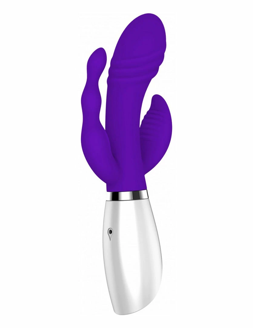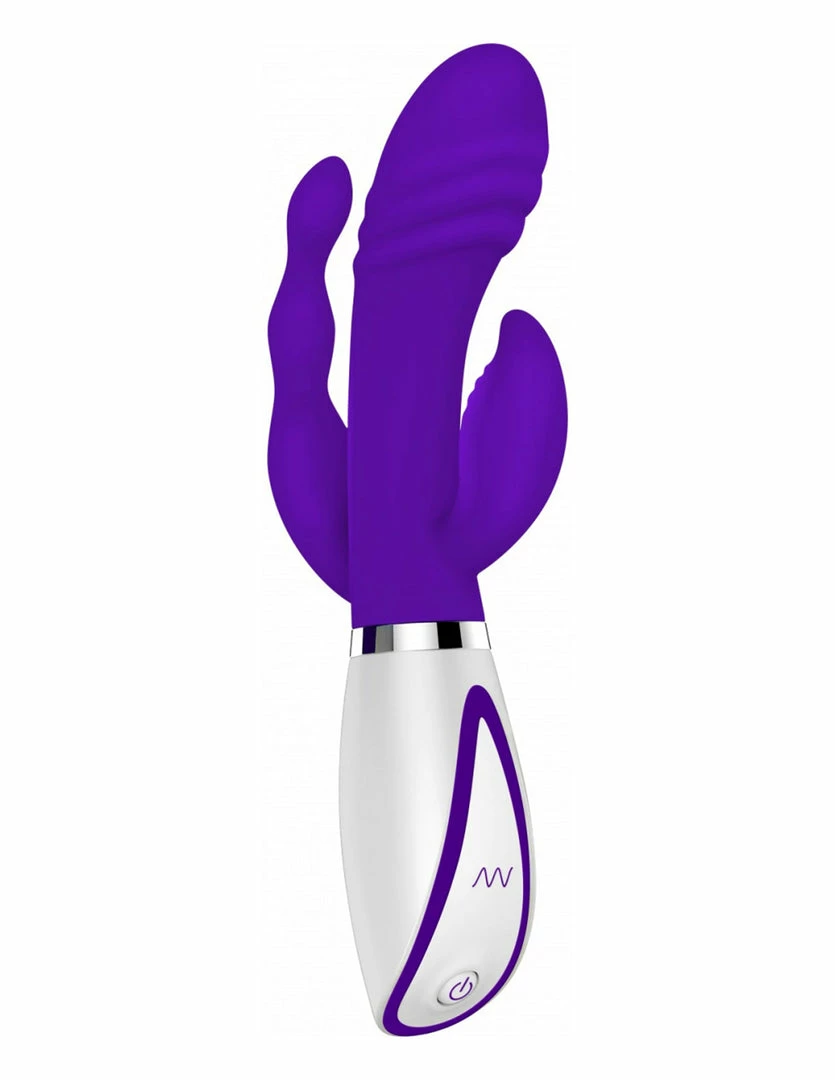 The Disco Triple Play by Evolved is a tri-stimulating vibrator. This vibrator double penetrates the vagina and anus while also stimulating the clitoris. It is 11 inches long, 2 inches wide, and has 4.2 inches of insertable length. It is made of smooth, easy to clean silicone material. It is USB rechargeable and waterproof. Use plenty of lubricant on all appendages for the best glide. Stimulating all 3 of these erogenous zones at the same time will result in strong orgasms.