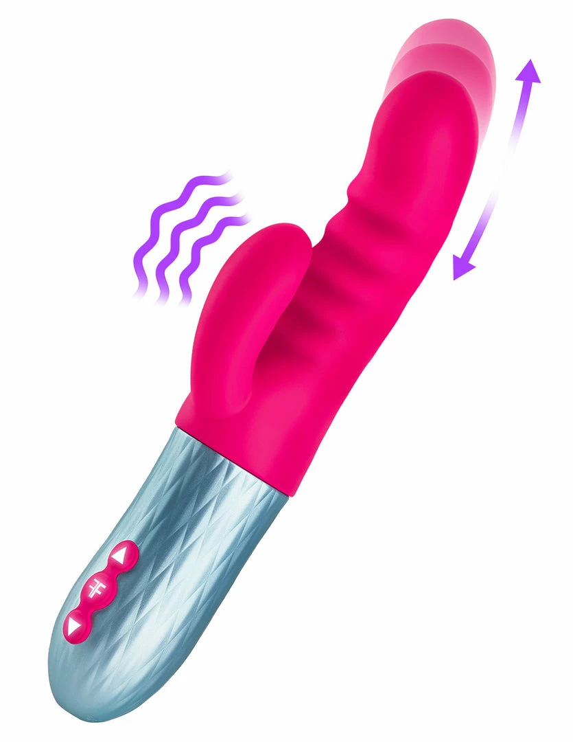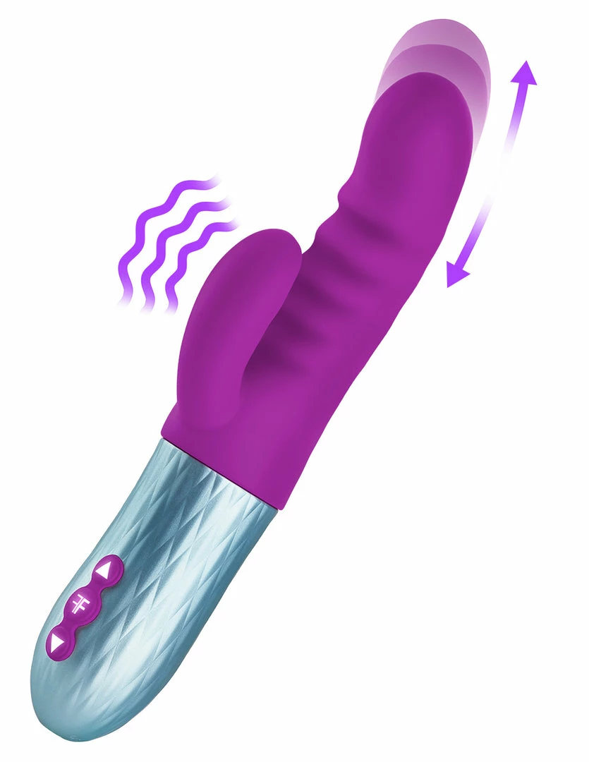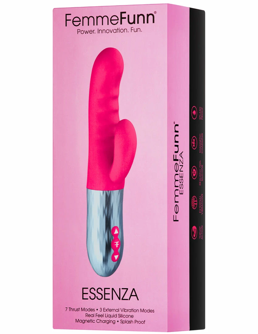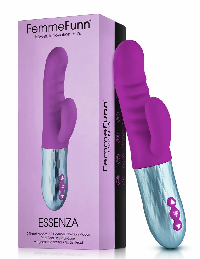 The Essenza by Femme Funn thrusts and vibrates. It is 9.3 inches long and 2.6 inches wide. It has 4.5 inches of insertable length. The tip has 0.5 inches of thrust expansion. It is made of premium silicone and ABS plastic. Essenza has multiple ridges for textural internal stimulation. The tip is curved to stimulate the g-spot. The clitoral piece also has rigid texture for manual stimulation.