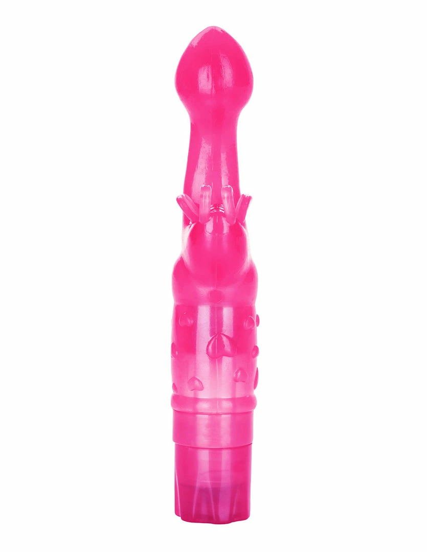 The Hustler Playthings Flutter Butterfly is a great first time vibrator. It stimulates the clitoris and the G-spot at the same time. The G-spot part is flexible and is 2.5 inches long. The piece is bulbous, as it is inserted it can massage against the G-spot. The soft butterfly wings were shaped for stimulating the clitoris. Its ribbed textures can please the clitoris and the outer lips as the G-spot piece goes inside. The dildo and clitoral piece are made with TPR jelly. This vibrator has one single button to control the vibrator speeds. This toy is 100% Waterproof. It requires 2 AAA batteries.