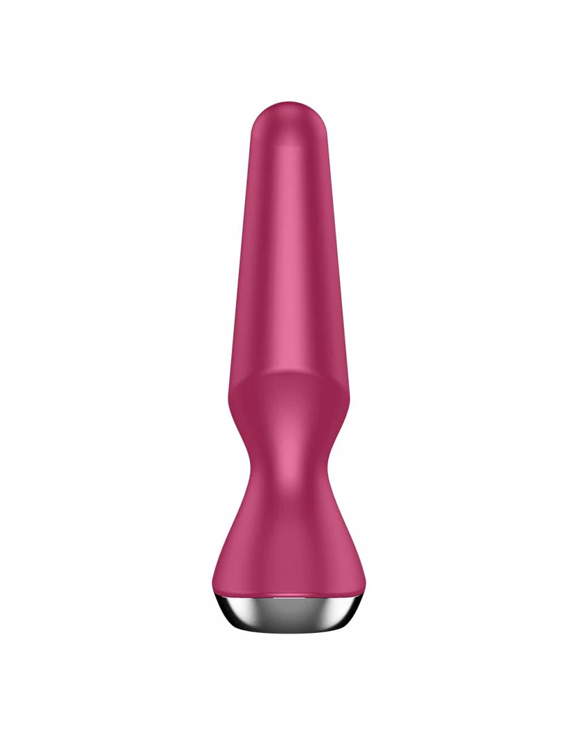 The Plug-ilicious 2 by Satisfyer is an app-controlled, conical, vibrating anal plug. This plug was designed to stimulate the p-spot and anal opening. It is 5.3 inches long and 1.6 inches wide. It is made of smooth silicone and ABS plastic. This plug can be used in the shower or tub. It is USB rechargeable and can be controlled with the Satisfyer Connect App.
