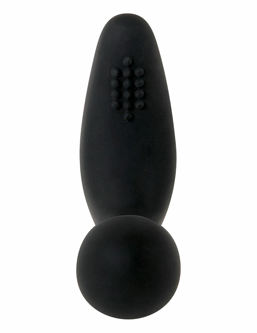 It has a tapered head for ease of insertion. The head is curved with multiple ridges for added texture to stimulate the prostate. Its prominent head can transfer vibration from the bullet to the attachment directly on to the prostate. The top side of the base has raised nubs to stimulate the perineum and testicles from the exterior.